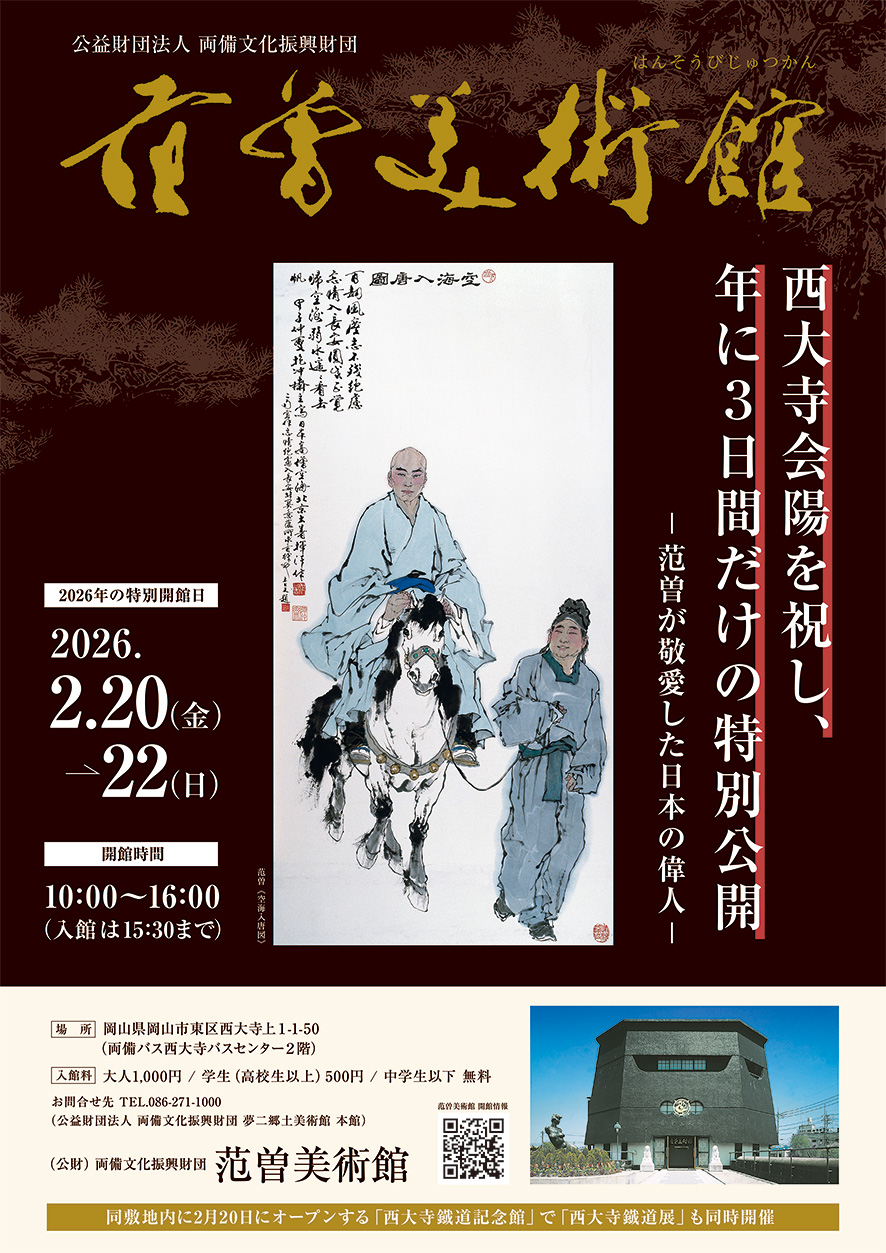 「幻の美術館」と称される范曽美術館3日間限定公開 西大寺会陽を祝して年に一度特別開館している范曽(はんそう)美術館(運営:公益財団法人 両備文化振興財団 館長:小嶋光信)は、2026年2月20日(金)から22日(日)までの3日間限定公開いたします。 今年は特別企画「范曽が敬愛した日本の偉人」というテーマで展観します。范曽は中国の故事人物を多く描いていますが、松田との交流をきっかけに日本の偉人を画題にした作品を多く制作しています。その中でも特に遣唐使の吉備真備、室町時代の画聖・雪舟、近現代... -