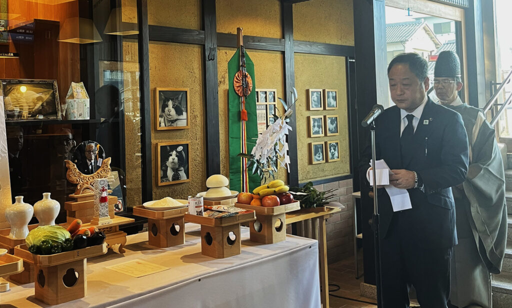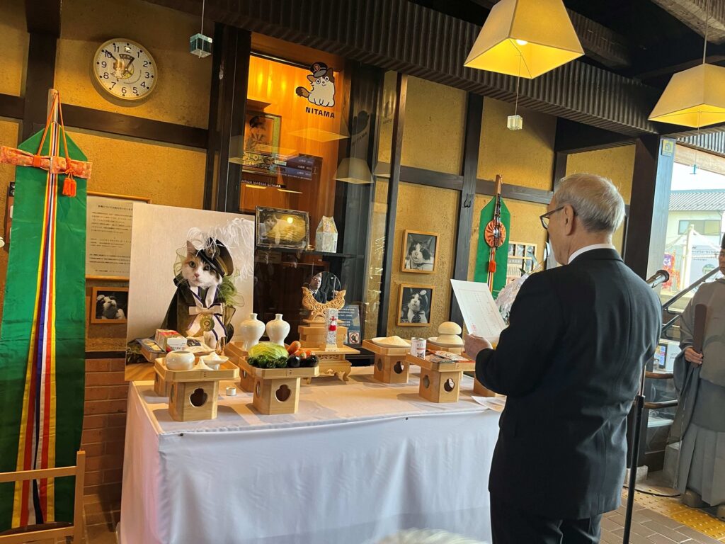 そして、これまで二タマ駅長へ温かい声援をしてくださった乗客の皆さん、今日もお手伝いしてくれた「貴志川線の未来をつくる会」の皆さん、和歌山県、和歌山市、紀の川市の知事、両市長はじめ行政の皆さんに感謝し、里親として温かく支えてくださった麻生専務取締役とご家族の皆さま、社員、同僚の猫駅長の皆様に心から敬意を表します。