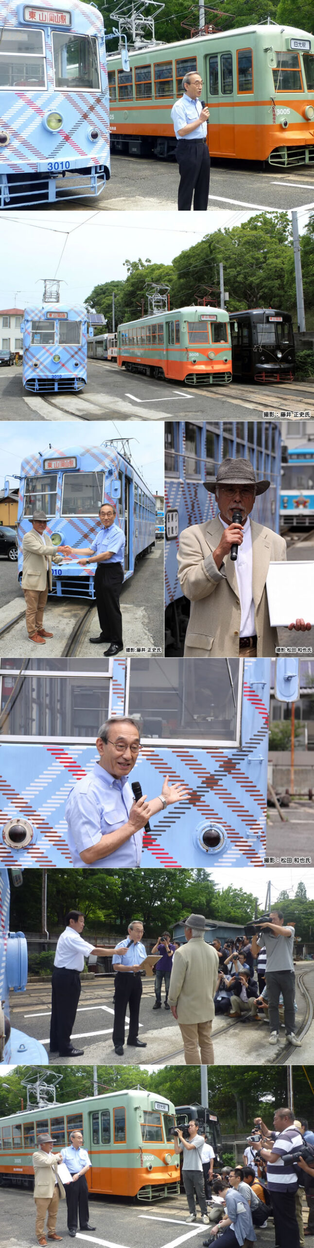 その中でもひときわ熱心だったのが「日光霧降高原・チロリン村」の山本社長で、前日に公募を知り、岡山まで飛んできて応募されました。山本社長は学生のころ日光軌道線を利用していて、地域のなじみの深いこの電車をふる里の日光に連れて帰りたいと思われての応募でした。結果、熱心さとふる里の日光への里帰りという2点を評価して、チロリン村を譲渡先と決定して、6月24日に「岡電3000形譲渡認定証書」を授与させていただきました。