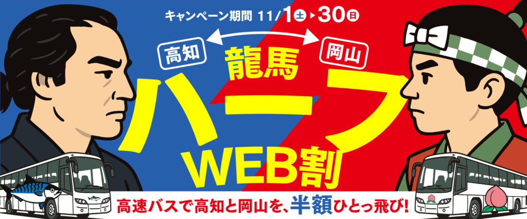 両備グループの両備ホールディングス株式会社両備バスカンパニー(社内カンパニー|カンパニー本部:岡山県岡山市中区国富615-1)は、ジェイアール四国バス株式会社、下津井電鉄株式会社、とさでん交通株式会社と共同運行する高速バス岡山~高知線において、11月1日(土)~11月30日(日)の期間限定で片道運賃半額キャンペーン 「龍馬ハーフWEB割」 を実施いたします。
