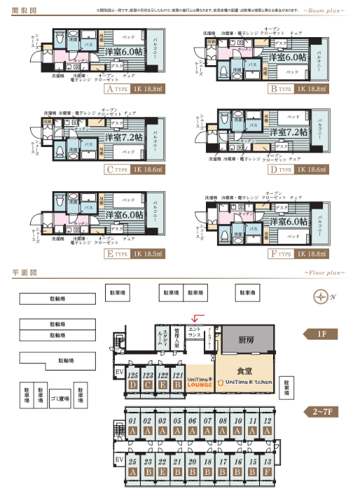 総戸数:124戸 1Kタイプ(18.5㎡~18.8㎡) 他1Rタイプ(18.6㎡)