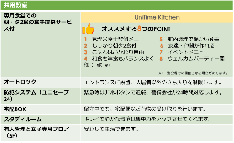 | 【共用部】 ラウンジ、コワーキングスペース ゲストルーム、シェアキッチン‘ コインランドリー、クリーニングサービス 自動販売機、 ドッグラン、リサイクルサービス ※学生マンション入居者は一部のみ利用可 | |