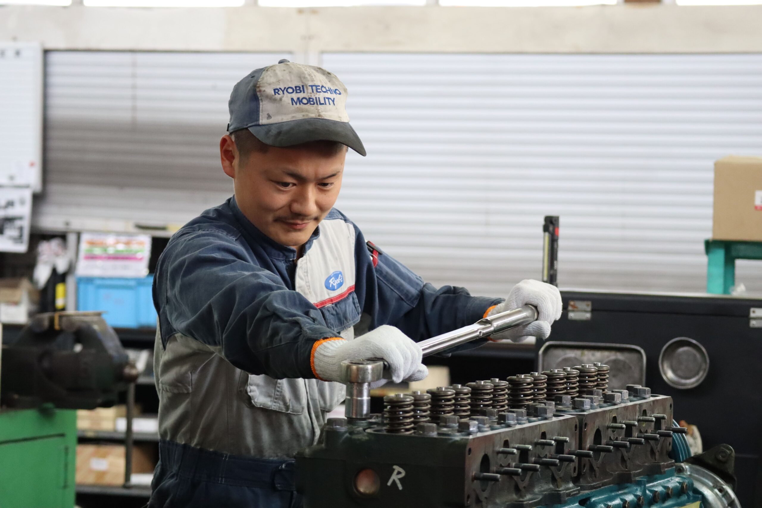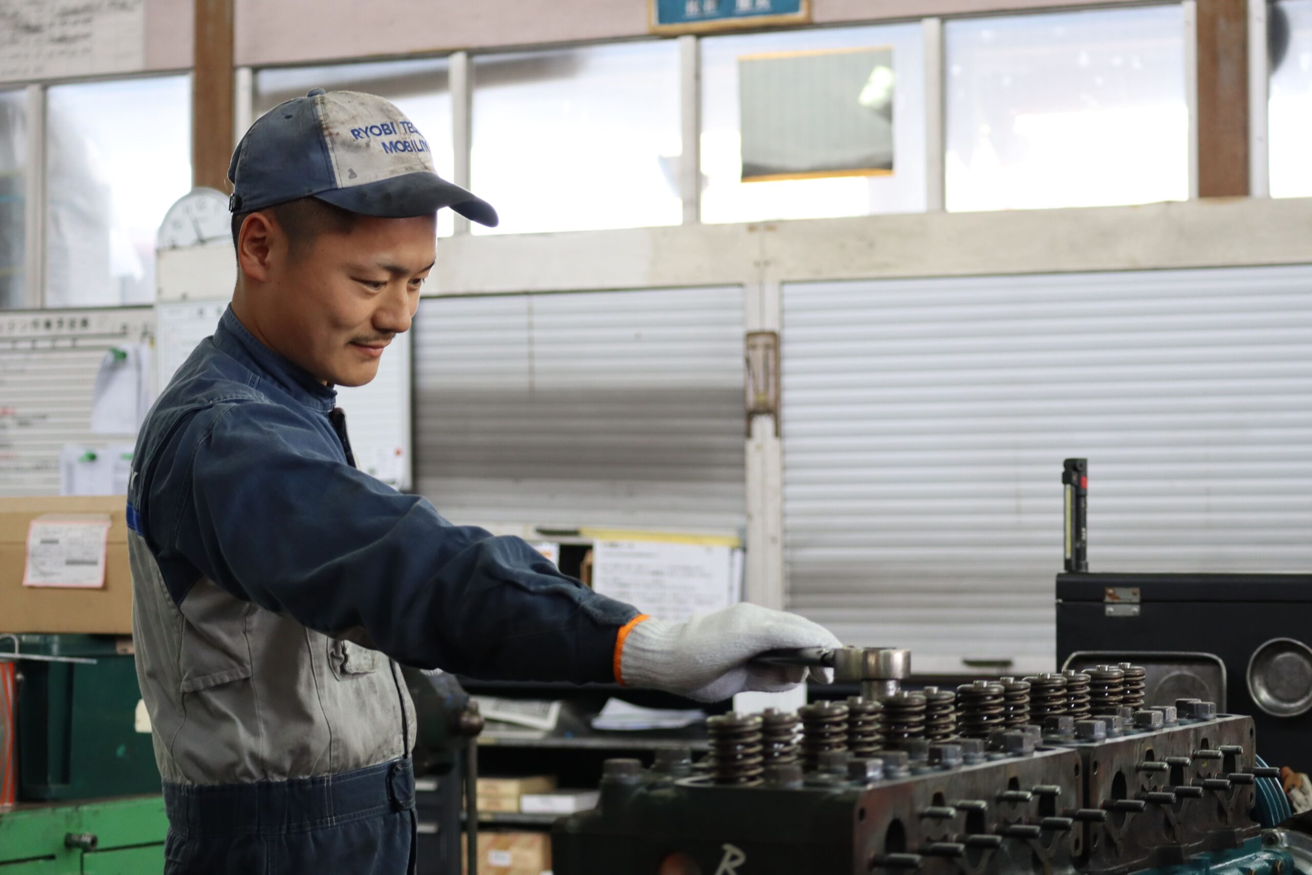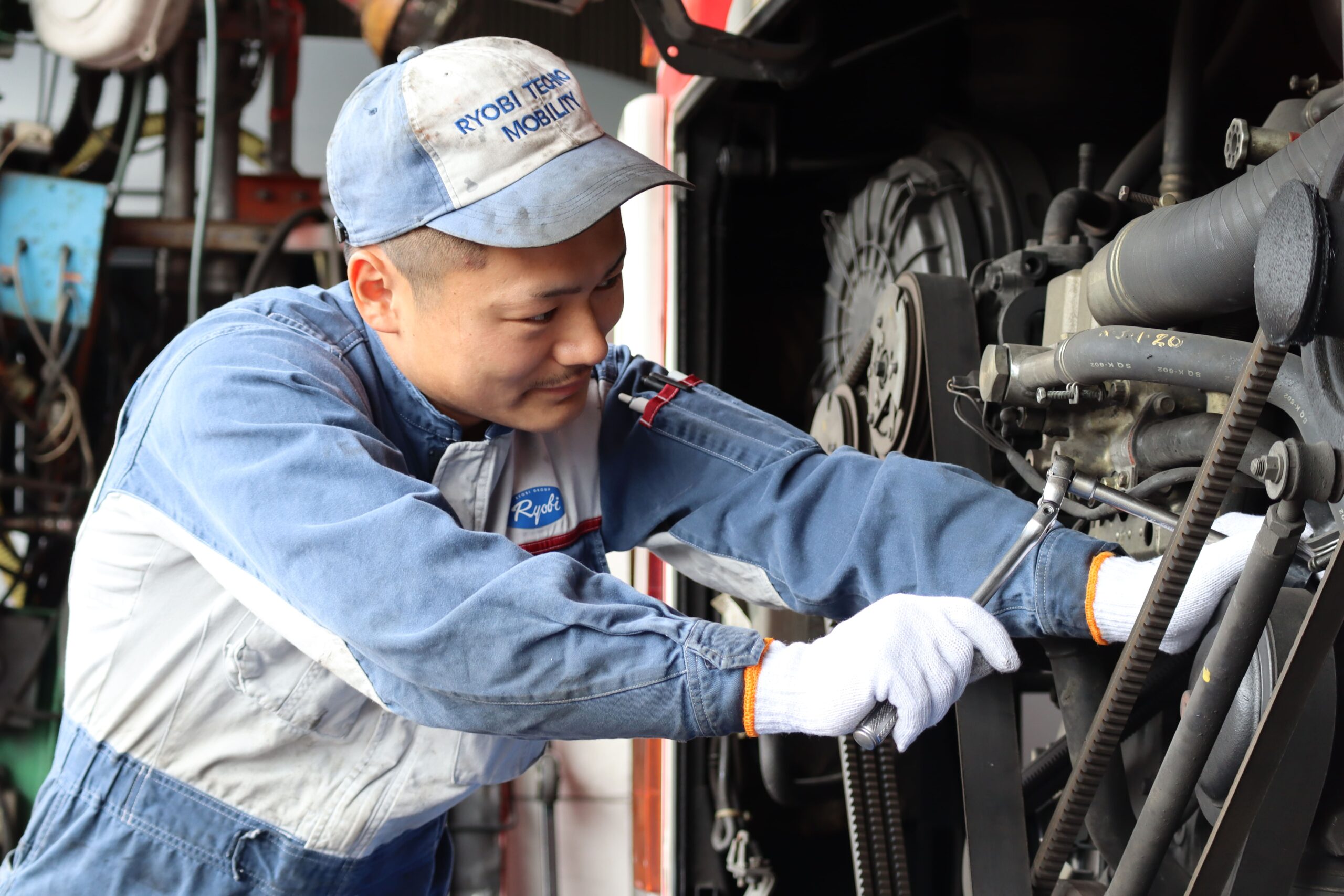 業務内容は、両備グループの大型トラック・バスなど様々な車種の主にエンジン関連の修理や整備、またグループ以外の車両や特殊機械にも対応しているため、メーカー問わず様々なエンジンに携わることができています。